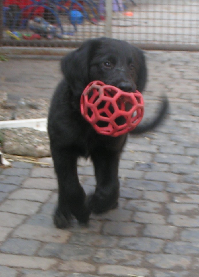 Das ist Babutz. Babutz ist rabenschwarz ohne ein weißes Haar, mit den schönen dunklen Augen seiner Mutter und wenn er einen damit anschaut... Babutz ist am glücklichsten wenn er in meiner Nähe ist und dann braucht er nicht unbedingt andere Menschen. Er ist bei allen häuslichen Arbeiten fürs Controlling zuständig. Daß dann anschließend mal der Putzlappen fehlt oder beim Start zum Spaziergang auffällt, daß der Wanderschuh mal wieder in den Zwinger “gewandert” ist, nimmt ihm natürlich keiner übel. Dieser Herzensbrecher liebt gemütliche Pausen und kleine Schmuseeinheiten genauso wie unsere Ausflüge und wilde Spiele mit seiner geliebten blauen Plüschbeißwurst.